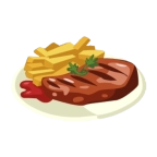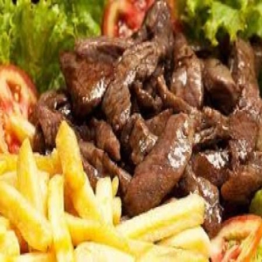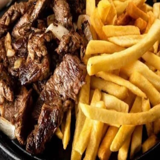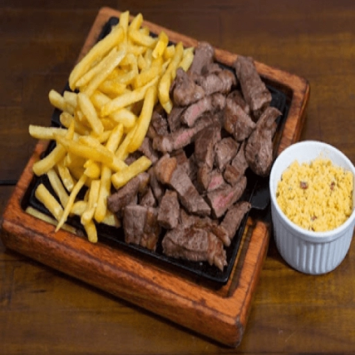 250g de Filé mignon em tiras, selado no azeite, acompanhado de batata frita e molho da casa.
