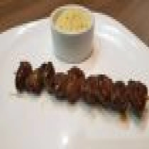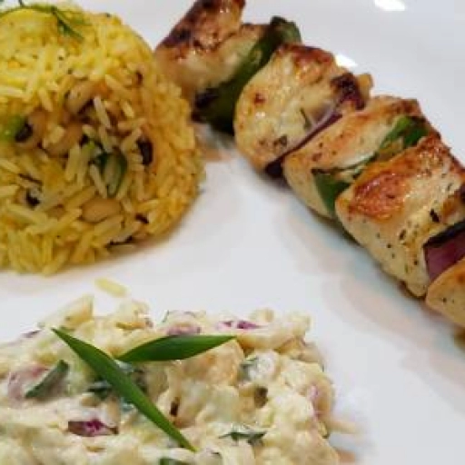 Espeto a sua escolha, arroz com brócolis ou arroz branco e batata frita.