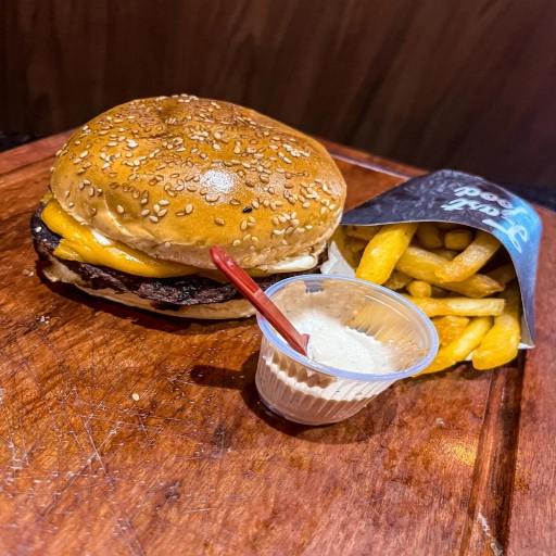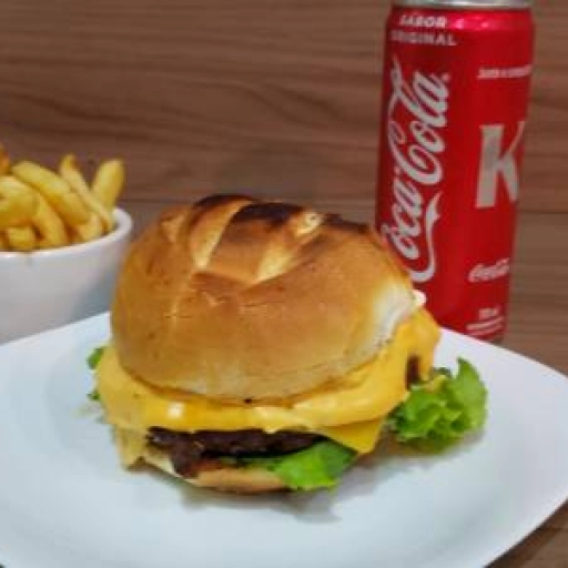Pão a sua escolha, blend artesanal de 150g, muçarela, cream cheese, molho da casa e batata frita.