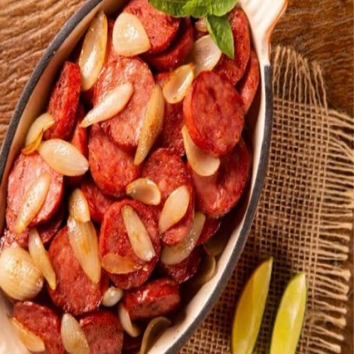 220 g de calabresa fatiada e selada na chapa, coberta de cebola.
