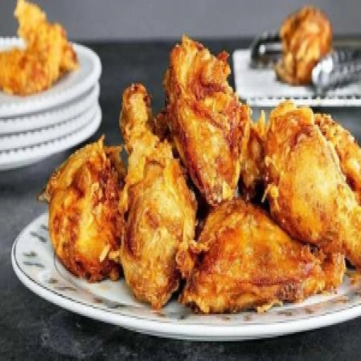Frango em pedaços, frito, servido com as guarnições do dia.