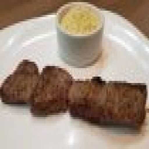 150g de Filé Mignon em fatia ao molho de vinho, acompanhado de arroz cremoso e chips de batata doce.
